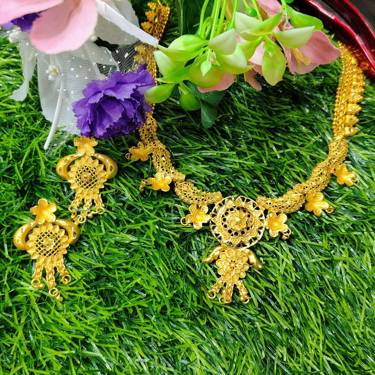 এই সেটের প্রতিটি উপাদান, তা নেকলেসের ডিটেইলড কাজ হোক বা কানের দুলের সূক্ষ্ম কারুকার্য, তৈরি হয়েছে অত্যন্ত যত্নের সাথে।💖